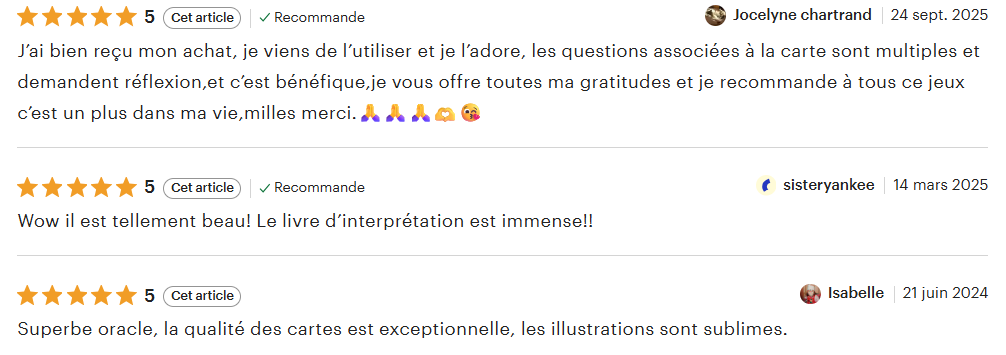 L'oracle vient avec un livret d'interprétation complet pour t'accompagner dans ton exploration. Que tu sois débutante ou habituée avec les oracles, tu y trouveras une foule d'informations, dont des exemples de tirages, des trucs pour booster ton intuition, une interprétation détaillée de chaque carte, des affirmations et des questions d'introspection pour activer des prises de conscience.